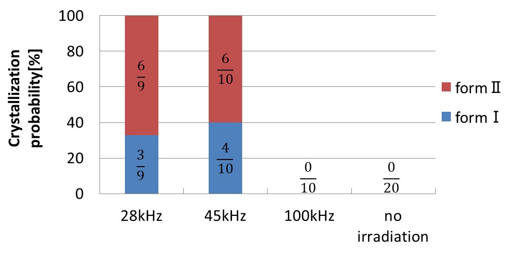 Polymorphs are solid phases in which the chemical composition is equal but the crystal structure differs. In the pharmaceutical industry, especially, most of compounds have polymorphs, and polymorphism control is very important because different polymorphs exhibit different stabilities, drug effects, formation properties, etc. Acetaminophen (Figure 1), which is one of the typical pharmaceutical compounds, has three known polymorphs, numbered I, II and III. The stable form I is the commercially used form because of its stability. In contrast, the metastable form II has been shown to be more soluble and more readily compressible into tablets than form I, and controlled crystallization of the form II is an important issue for practical use. Hence we attempted to control polymorphism of acetaminophen form II by ultrasonic irradiation in this study. Acetaminophen aqueous solutions (32 mg/ml, total 50 bottles) were prepared, cooled to 0°C at a constant cooling rate (3°C/h), maintained at that temperature for about 2 days, and irradiated with ultrasound with different frequencies (no irradiation, 28, 45, 100 kHz) for investigating the effect of crystallization and polymorphism control. Figure 2 shows the probability of nucleation and form II crystallization on each condition. In the cases of no irradiation and 100 kHz irradiation, nucleation did not occur in solutions (no irradiation: 0/20 (0%), 100 kHz: 0/10 (0%)). In contrast, ultrasonic irradiation with the frequency of 28 or 45 kHz promoted the nucleation (28 kHz: 9/9 (100%), 45 kHz: 10/10 (100%)), and also increased probability of the form II crystallization as shown in Figure 2 (28 kHz: 6/9 (67%), 45 kHz: 6/10 (60%)).