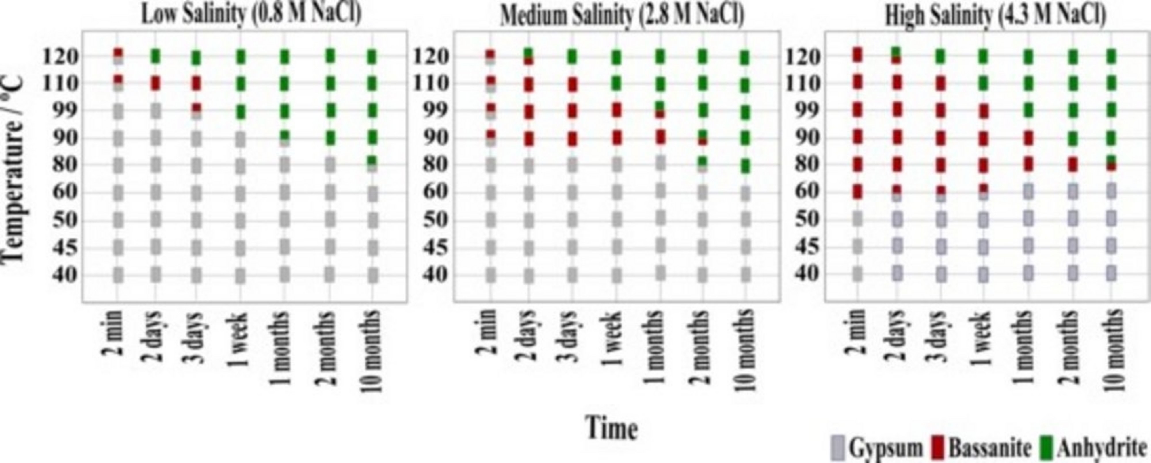 Precipitation process and phase stability of calcium sulfate; The role of temperature, salinity and time of reaction |