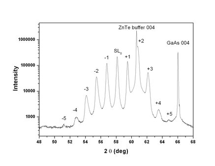 MnTe is well-known magnetic semiconductor which can crystallize it two phases. The stable MnTe crystal phase is the hexagonal one of the NiAs type. The metastable MnTe phase with the zinc blende (ZB) structure can be obtained with the use of non-equilibrium growth techniques only, such as MBE. This phase exhibits an antiferromagnetic (AF) order of type-III at low temperatures (Néel temperature of about 65 K). This kind of magnetic order persists also in MnTe layers in MnTe/ZnTe superlattices (SLs). Because of the distortion of the fcc lattice an energy-minimizing magnetic configuration with the unit cell doubling direction along the SL growth axis is realized in such structures. Due to this property the SLs above mentioned are characterized by the single orientation of magnetic domains. The presence of an interlayer exchange coupling has been reported for selected MnTe/ZnTe short-period SLs previously [1,2] but details of this coupling and an anomalous temperature behavior of features observed by the neutron diffraction were not fully understood. The goal of the current research was to get more information on the magnetic properties of various SLs mentioned above. Several MBE-grown, MnTe/ZnTe short period SLs with various numbers of monolayers (MLs) in magnetic and non-magnetic slabs were grown by MBE at the Institute of Physics PAS in Warsaw. Prior to the growth of the SL the ZnTe buffer layer was deposited onto (001)-oriented 2°off GaAs substrate. The typical SL single bilayer was composed of 15 or 20 MnTe MLs and of 4 to 10 ZnTe MLs. In every case the SL contained 200 periods, so its thickness was close to 1 micrometer. The separate set of SLs corresponded to structures with similar period values as those mentioned above but with much smaller number of MnTe MLs (7, 8 or 9) and 18 ZnTe MLs. The crystal quality of grown samples and their structure parameters were checked by the high-resolution XRD measurements with the use of Cu Ka1 radiation. The typical diffraction pattern obtained at RT for one from our samples is shown in Fig. 1. The real and the nominal values of parameters describing typical SL bilayer were the same (possible difference in the case of the highest number of MnTe MLs does not exceed 0.5 ML). Next, the samples were analyzed by elastic and inelastic neutron scattering performed at Laboratoire Léon Brillouin in Saclay. The first type of measurements tooks advantage of 4T2 spectrometer installed on the cold neutron source. The results of these measurements demonstrated a magnetic coherence in selected SLs for a distance as high as 900 Å at low temperatures. The temperature behavior of spectra observed in our experiments was found to be quite different from that previously reported in the literature. Due to careful analysis of the form of neutron diffraction structures at a few Brillouin zones we were able to propose the model of local magnetic order in SL. Possible physical mechanisms responsible for observed magnetic correlation in AF-ordered MnTe layers of these SLs given in the literature are mentioned and discussed. In our earlier studies we have determined the collective magnetic excitations (magnons) dispersion in quasi-bulk ZB-MnTe slab at low temperature (in AF-III phase) by inelastic neutron scattering [3]. In current research we have observed not only a long-range coherency between AF layers for ZnTe spacer thickness up to ~25 Å, but also the propagation of collective magnetic excitations (magnons) along the SL-stacking direction in short-period SLs. For large enough ZnTe spacers, on the other hand, the AF MnTe layers are no longer correlated and size quantization effects (confinement) for magnons take place. The effective magnetic volume for investigated SLs varied between 0.15 mm3 and 0.30 mm3 so the counting time was equal to about 20 minutes per step. The experimental evidence of both effects mentioned above was found in our inelastic neutron scattering measurements, performed with the use of thermal neutron beams. A similarity of theoretically predicted and experimentally observed magnon spectra was also shown. To the best of our knowledge presented results constitute the first clear evidence of magnon propagation and magnon confinement in SLs containing magnetic semiconductor that was demonstrated with the use of inelastic neutron scattering technique. Fig. 1. The X-ray diffraction pattern collected for the (MnTe)18/(ZnTe)7 SL. This work was partially supported by the research grant N N202 128639 from Ministry of Science and Higher Education (Poland) and by the European Commission under the 7th Framework Programme through the 'Research Infrastructures' action of the 'Capacities' Programme, NMI3-II Grant number 283883. [1] J. Lin, J.J. Rhyne, J.K. Furdyna, T.M. Giebultowicz, J. Appl. Phys. 83, 6554 (1998). [2] L.E. Stumpe, J.J. Rhyne, H. Kaiser, S. Lee, et. al., J. Appl. Phys. 87, 6460 (2000). [3] B. Hennion, W. Szuszkiewicz, E. Dynowska, E. Janik, T. Wojtowicz, Phys. Rev. B, 66, 224426 (2003). ___________________________________________________ * Corresponding author. E-mail address: [email protected] |