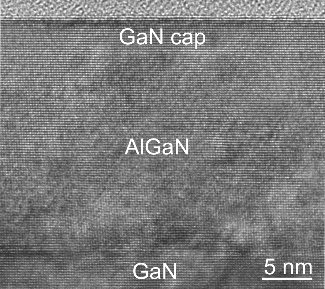 The AlGaN/GaN high electron mobility transistor (HEMT) structures were grown on the (0001) HVPE bulk GaN substrates using plasma-assisted molecular-beam epitaxy (PAMBE). The AlGaN layers of content of 12% or 20% were grown to nominal 20nm thickness and the 3nm thick GaN cap was added. High-resolution X-ray diffraction (HRXRD) measurements were used to determine crystallographic quality of HEMT structures. Built-in strain was obtained from peak intensity analysis. An effective lattice constant was derived from the shifts of the peaks positions. These X-ray data were compared to local measurements performed by transmission electron microscopy (TEM) – Fig.1. Tetragonal distortion was used for lattice strain in the interface regions. Structure geometry was also obtained from TEM images. Overall quality of the structures and their performance was assessed. Figure 1. TEM image of HEMT structure.