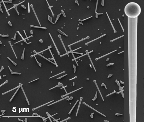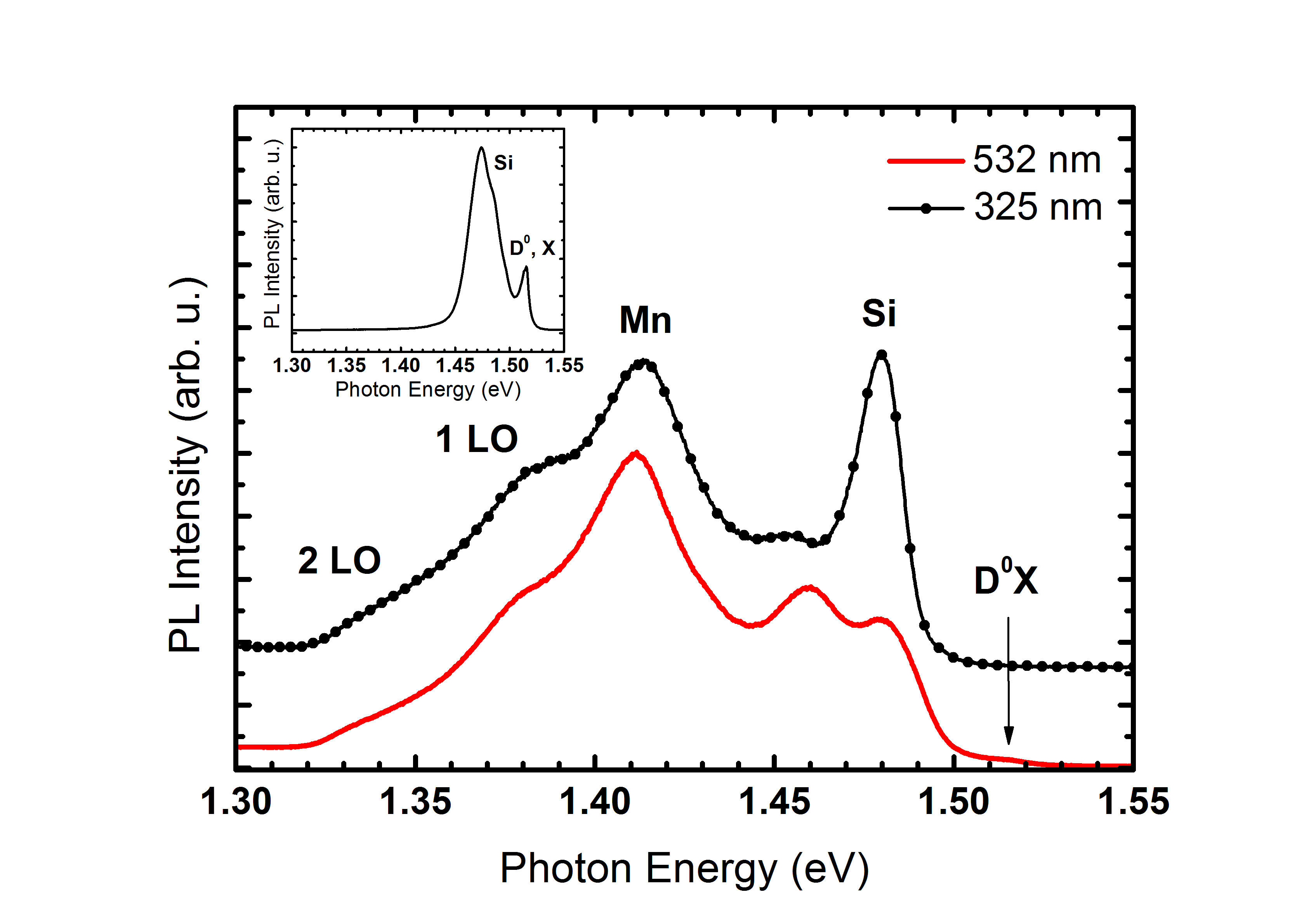 Figure 1. Scanning electron microscopy images of GaAs:Mn nanowires grown on Si(100). Figure 2. Low temperature PL spectra (normalized to the highest intensity) for GaAs:Mn NWs at different excitations (532 nm and 325 nm laser lines). The inset shows the low temperature PL spectrum of GaAs NWs at excitation of 532 nm laser line.