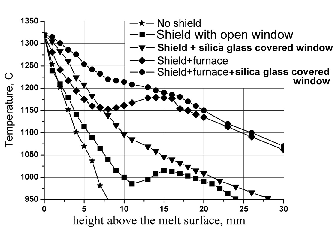 Fig.1. The temperature distribution above the melt surface REFERENCES 1. X. Mateos, V. Petrov, J. Liu, et al., IEEE J. Quantum Electron. 42, 1008 (2006). 2. Yu.K.Voron’ko, K.A.Subbotin, V.E.Shukshin, D.A.Lis, S.N.Ushakov, A.V.Popov, E.V.Zharikov. Optical Materials, 2006, vol. 29, p. 246-252 3. F.A. Bol'shchikov, E.V. Zharikov, N.G. Zakharov, D.A. Lis, P.A. Ryabochkina, K.A. Subbotin, O.L. Antipov. Quantum Electronics, 2010, Vol.40 (2) p. 101-102 4. F.A. Bol'shchikov, E.V. Zharikov, D.A. Lis, N.G. Zakharov, P.A. Ryabochkina, K.A. Subbotin, O.L. Antipov, QUANTUM ELECTRON, 2010, 40 (10), 847–850. 5. P.A. Ryabochkina, S.A. Antoshkina, S.A. Klimin, D.A. Lis, K.A. Subbotin, S.N. Ushakov, E.V. Zharikov. Journal of Luminescence, Volume 138, 2013, p.32–38 6. F.Cornacchia, A.Toncelli, M.Tonelli, E.Favilla, K.A.Subbotin, V.A.Smirnov, D.A.Lis, E.V.Zharikov. J. Appl. Phys. 101, p. 123113 1-7, (2007) 7. F.A. Bolschikov, G.M.Kuz’micheva, D.A.Lis, Yu.M.Papin, A.V.Popov, P.A.Ryabochkina, V.B.Rybakov, V.G.Senin, V.A.Smirnov, K.A.Subbotin, Yu.K.Voron’ko, V.V.Voronov, E.V.Zharikov. Journal of Crystal Growth v. 311 iss. 17 (2009) p. 4171–4178 8. G.M. Kuzmicheva, V.B. Rybakov, K.A. Subbotin, E.V. Zharikov, D.A. Lis, O.Zaharko, D.A. Nikolaev, V.G. Senin. Russian Journal of Inorganic Chemistry, Vol. 57, No. 8, 2012, p. 1128 9. D. A. Lis, K. A. Soubbotin, E. V. Zharikov, et al., in Proceedings (Technical Digest) of 18th Topical Meetings on Advanced Solid State Photonics, San-Antonio, USA, 2003 (San-Antonio, 2003). |