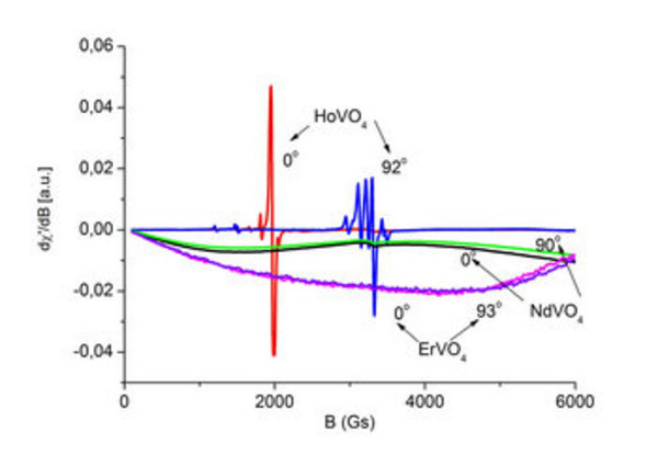 Single crystals of NdVO4, HoVO4 and ErVO4 were grown by the Czochralski method in an inductively heated iridium crucible of 40 x 40 mm and with an passive afterheater. Starting materials with 4N purity were heated at 1000 °C (Nd2O3, Ho2O3 and Er2O3) or at 300°C V2O5 for 6 hours before weighing, mixing and melting. Due to evaporation of vanadium from the melt during crystal growth process [1] composition of starting oxides was 1 mol.% shifted towards higher concentration of V2O5. Single crystals with 20 mm diameter were grown on an iridium 2 mm rod with pulling rate of 3-4 mm/h and a rotation of 4-6 rpm. Crystals were grown under ambient pressure in a nitrogen atmosphere. During crystallization strong tendency to spiral growth was observed, especially for HoVO4. In spite of lack of crystal seed most crystals started to grow along direction close c-axis with a- and b-planes (cleavage planes) on the side. Obtained single crystals were transparent with strong coloring – violet for NdVO4, yellow for HoVO4 and pink for ErVO4. EPR spectra of the three well oriented crystals were recorded on a conventional X-band Bruker ELEXSYS E 500 CW-spectrometer (Bruker Analytik GmbH, Rheinstetten, Germany) operating at 9.5 GHz with a 100-kHz magnetic field modulation. The first derivative of the absorption spectra has been recorded as a function of the applied magnetic field. Temperature dependence of the EPR spectra of the samples in the 3–300 K temperature range was recorded using an Oxford Instruments ESP nitrogen-flow cryostat (Oxford Instruments Ltd., Witney, UK). EPR-NMR program was applied to recognize spin Hamiltonian parameters of the rare-earth ions [2]. [1] K. Oka, H. Unoki, H. Shibata, H. Eisaki, Journal of Crystal Growth 286 (2006) 288–293 [2] M.J. Mombourquette, J.A. Weil, and D.G. McGavi: EPR-NMR User’s Manual (Department of Chemistry, University of Saskatchewan, Saskatoon, Canada, 1999). |