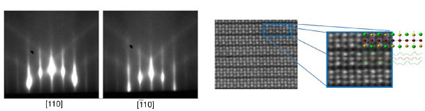 a) RHEED images of the surface of a CuMnAs layer during growth on a GaP substrate. b) Z-contrast TEM image of CuMnAs along the [1 0 0] direction. The As positions are clearly visible as the brightest atoms, and intensity analysis along the rows reveal a highly ordered compound in complete agreement with the overlaid model structure [1] Chiba, D.; Y. Sato, T. Kita, F. Matsukura, H. Ohno. "Current-Driven Magnetization Reversal in a Ferromagnetic Semiconductor (Ga,Mn)As/GaAs/(Ga,Mn)As Tunnel Junction". Phys. Rev. Lett. 93 (21): 216602. [2] Gould, C.; C. Ruster, T. Jungwirth, E. Girgis, G. M. Schott, R. Giraud, K. Brunner, G. Schmidt, L. W. Molenkamp. "Tunneling Anisotropic Magnetoresistance: A Spin-Valve-Like Tunnel Magnetoresistance Using a Single Magnetic Layer". Phys. Rev. Lett. 93 (11): 117203. [3] Giddings, A. D.; M. N. Khalid, T. Jungwirth, J. Wunderlich, S. Yasin, R. P. Campion, K. W. Edmonds, J. Sinova, K. Ito, K.-Y. Wang, D. Williams, B. L. Gallagher, C. T. Foxon. "Large Tunneling Anisotropic Magnetoresistance in (Ga,Mn)As Nanoconstrictions". Phys. Rev. Lett. 94 (12): 127202. [4] Park, B. G.; Wunderlich, J.; Marti, X.; Holy, V.; Kurosaki, Y.; Yamada, M.; Yamamoto, H.; Nishide, A.; Hayakawa, J.;Takahashi, H.; Shick, A. B.; Jungwirth, T. Nature Mat. 2011, 10, 347. [5] Martı, X.; Park, B. G.; Wunderlich, J.; Reichlova, H.; Kurosaki, Y.; Yamada, M.; Yamamoto, H.; Nishide, A.; Hayakawa, J.;Takahashi, H.; Jungwirth, T. Phys. Rev. Lett. 2012, 108, 017201. [6] Shick, A. B.; Khmelevskyi, S.; Mryasov, O. N.; Wunderlich, J.; Jungwirth, T. Phys. Rev. B 2010, 81, 212409. [7] Jungwirth, T. et al. Phys. Rev. 2011, B 83, 035321. [8] Cava, R. J. Physics 2011, 4, 7. |
