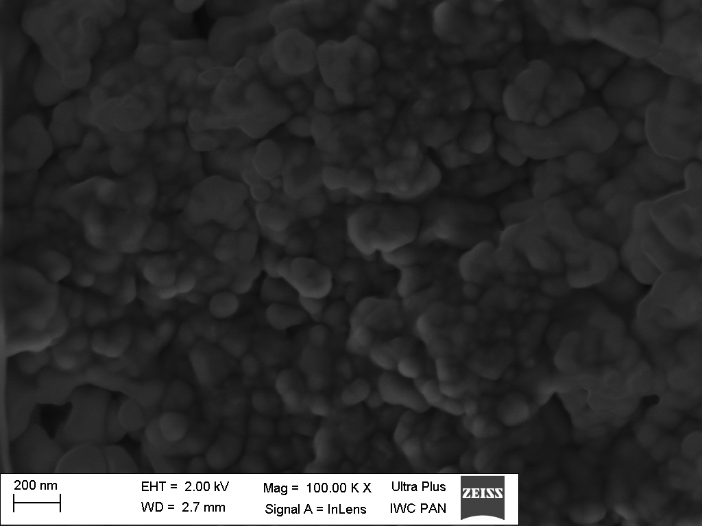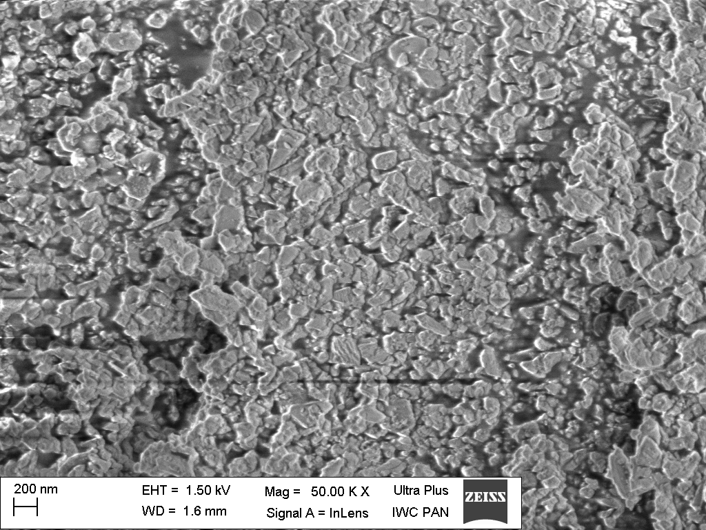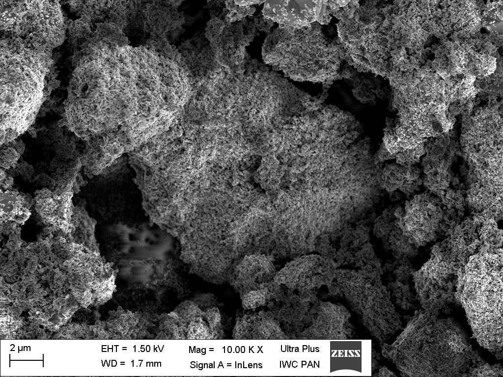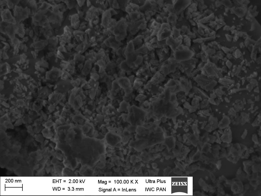 Fig. 1. The structure of the mixture of ASM5 0.1/0 statically synthesized diamond nanopowder and tungsten trioxide powder (46%) formed in a liquid after drying before annealing in hydrogen During the mixture heat treatment in hydrogen at the temperature of 900 °C the complete recovery of WO3 to the metal tungsten occurs. In case of deviation from the heat treatment the W3O oxide is present in the mixture, together with metallic tungsten and WO2. The particle size of formed tungsten increased by 2–3 times compared to the WO3 precursor particles (fig. 2). The formed particles are less fragmented.