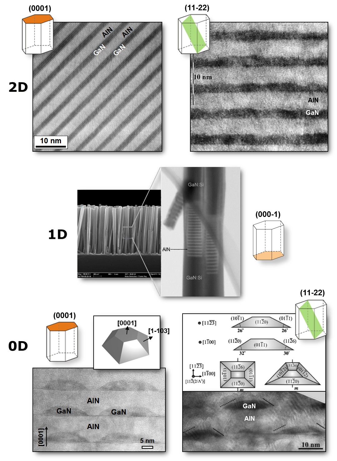 Due to the low growth temperature and in-situ monitorization capabilities, Molecular-Beam Epitaxy (MBE) is the most suitable growth technique for devices or structures with low dimensionality, critical interface sharpness or immiscibility challenges. This talk will start with an introduction to plasma-assisted MBE of III-nitride materials, discussing the surface energy role on the control of the growth morphology. For growth temperatures high enough to grant a certain mobility of the group-III species at the growing front (>700°C in the case of GaN), variations of the III/V flux ratio result in changes of the surface potential that allow switching from Frank-Van der Merwe to Stranski-Krastanow growth mode. The transition from two-dimensional to three-dimensional growth can also be induced by a growth interruption due to the variation of the surface stoichiometry associated to the metal desorption in vacuum. The application of these principles to the synthesis of (0001)-, (000-1)- and (11-22)-oriented nanostructures (quantum wells, quantum dots) will be addressed, paying attention to the particularities of those surfaces in terms of adatom mobility and metal wetting properties. Starting from the growth diagrams of the various GaN faces, we will study the incorporation of In or/and Al to form ternary or quaternary compounds. The modification of the growth kinetics in presence of dopants (Si, Mg, Mn) will be analyzed. The growth of a complete device structure requires specific growth processes, conditioned by the less thermally stable layer and by the specifications in terms of interface quality. Interfacial reactions, defects and interdiffusion will be discussed for the case of GaN/AlGaN and GaN/InGaN. The advantages of plasma-assisted MBE find direct application in GaN/AlGaN intersubband (ISB) optoelectronics, technology that requires the control of the nanostructure dimensions and interface sharpness at the atomic scale. III-nitride heterostructures are excellent candidates for high-speed ISB devices thanks to their large conduction band offset (~1.8 eV for the GaN/AlN system) and subpicosecond ISB scattering rates. However, due to the rather large GaN electron effective mass (m* = 0.2m0), quantum wells as thin as 1-1.5 nm are required to achieve ISB absorption at 1.3-1.55 µm. In this talk, we will summarize the latest achievements in terms of MBE growth and characterization of ultra-thin GaN/Al(Ga)N QW and QD superlattices in polar and semipolar crystallographic orientations for the fabrication of ISB optoelectronic devices. |