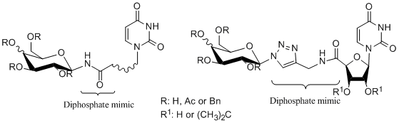 Glycosyltranferases are enzymes responsible for the formation of the glycosidic bond in living system. They transfer the sugar unit from a nucleoside diphosphate sugar (NDP-sugar e.g. UDP-glucose) to a specific hydroxyl- or amino- group of the acceptor substrate which is usually other sugar but nucleic acids, proteins, lipids and other small molecules are also encountered [1]. Modification of many structures through addition of sugars unit can have a significant impact on their physical, chemical or biological properties. Current research confirms that cell surface glycoconjugates have pivotal functions in various cellular recognition systems involving cell differentiation, development, inflammation, immune response, bacterial/viral infections, and many other intercellular communications [2]. In recent years increased attention toward GTs inhibitors has emerged due to key role of these enzymes in biological synthesis of glycoconjugates and polysaccharides. Development of new selective inhibitors is of great importance in dealing with bacterial [3] and fungal diseases [4]. Analogues of NDP-sugar can have an important role as new drug candidates. Our recent research led to analogues of GTs natural substrates in which diphosphate moiety was replaced with amide unit connecting carbohydrate to cyclic or acyclic nucleoside part. Alternative route includes 1,2,3-triazole linkage installed by dipolar cycloaddition. ![]() Acknowledgement Research studies part-financed by the European Union within the European Regional Development Fund (POIG.01.01.02-14-102/09). Roman Komor received a scholarship under the project DoktoRIS - Scholarship Program for Innovative Silesia. References: [1] L. L. Lairson, B. Henrissat, G. J. Davies, S. G. Withers, Annu. Rev. Biochem., 2008, 77, 521-555. [2] K. Hosoguchi, T. Maeda, J. Furukawa, Y. Shinohara, H. Hinou, M. Sekiguchi, H. Togame, H. Takemoto, H. Kondo, S.-I. Nishimura, J. Med. Chem., 2010, 53, 5607-5619. [3] S. Berg, D. Kaur, M. Jackson, P. J. Brennan, Glycobiology, 2007, 17, 35-56. [4] J. B. Behr, A. Gainvors-Claisse, A. Belarbi, Nat. Prod. Res., 2007, 21, 76-82. |