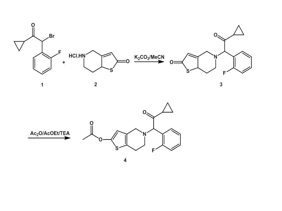 The determination of small organic and inorganic ions is an important part of pharmaceutical analysis. Many drug molecules are charge and are manufactured with counterion. Hence, it is important to analytically characterize the drug stoichiometry to ensure that the potency of the batch of drug substance is known. On the other hand small organic and inorganic ions could be a contaminant impurities coming from the synthetic route and the task of impurity determination in drug is of principle importance. Prasugrel is the most recent member of the thienopyridine class of antiplatelet agents1. Similarly to other thienopyridines, it is commonly used in a therapy of choice for patients with acute coronary syndrome (ACS) undergoing percutaneous coronary intervention (PCI) with stent implantation2,3. To date, the registered medication brands with prasugrel contain the active substance (API) in the form of hydrochloride salt. The last steps in our synthetic procedure comprise the O-acetylation of 5-(2-cyclopropyl-1-(2-fluorophenyl)-2-oxoethyl)-5,6,7,7a-tetrahydrothieno[3,2-c]pyridin-2(4H)-one (3) to the compound 4, in basic reaction conditions and a presence of acetic anhydride, then the formation of prasugrel salt. During coupling reaction workup the acetic anhydride may convert to acetic acid or its salts followed the acetic acid formation as an impurity in final procedure for prasugrel hydrochloride obtaining.