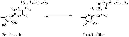 In spite of enormous literature (over 6800 papers) reporting biochemical, pharmacological or medicinal data, the molecular structure of capecitabine was rarely described. Scarce spectral and crystal data are not consistent with respect to the tautomeric forms occuring in solid or liquid phases. This has prompted us to study capecitabine in DMSO-d6 (at room temperature) and THF-d8 (at various temperatures) solutions. Based on 1H, 13C, 15N and 19F NMR (HSQC, HMBC) spectra it was found that at least two tautomeric forms (I-amino, II-imino) exist in equilibrium.