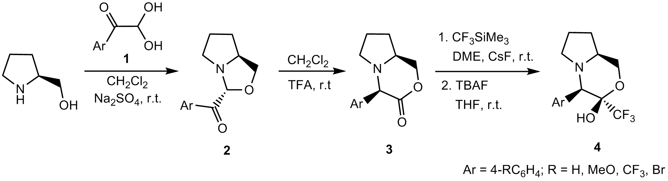 The goal of the present study was the synthesis of bis-heterocyclic compounds starting with L-prolinol and arylglyoxals 1. The initial formation of bis-heterocycles 2 was in line with the results of a similar study already described in the literature [4]. However, we found that they are labile compounds and smoothly undergo diastereoselective isomerisation in the presence of an acidic catalyst yielding bicyclic morpholinones 3.