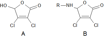 3,4-dichloro-5-hydroxy-2(5H)-furanone (mucochloric acid) is a substrate for synthesis of compounds with interesting chemical and biological properties. The derivatives of 2(5H)-furanone are currently a large group of heterocyclic compounds, among which are natural substances, medications exhibiting various biological activity and compounds used in chemical synthesis [1-8]. The 2(5H)-furanone subunit is a leading structure in many biologically active natural substances such as antimicrobial rubrolides or basidalin. The anticancer properties in milimole concentrations of several mucochloric acid were also reported [1].