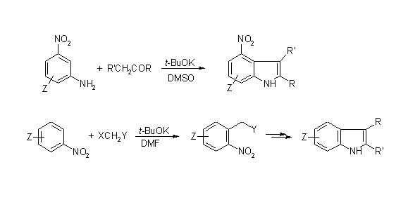 Nucleophilic substitution of hydrogen in nitroarenes, SNArH, proceeds via fast addition of nucleophiles at positions occupied by hydrogen to form σH adducts that are subsequently converted into products of substitution of hydrogen on a few ways. It should be stressed that SNArH proceeds much faster than conventional nucleophilic substitution of halogens, SNAr. Facile introduction a variety of functionalized carbon substituents into nitroaromatic rings via SNArH with carbanions opens wide possibilities for synthesis of indoles as exemplified in scheme