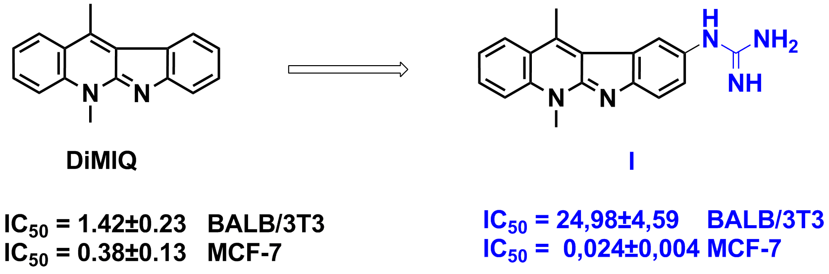 | 5,11-dimethyl-5H-indolo[2,3-b]quinoline (DiMIQ), the synthetic analogue of the neocryptolepine, displays high cytotoxic activity, which is comparable to the cytotoxic activity of doxorubicin, but the high toxicity of DiMIQ and its low bioavailability inspired us to look for new analogues of DiMIQ. Numerous examples in recent literature and first results of our investigations reveal that the lowered toxicity of DiMIQ can be achieved by a construction of a conjugate composed of DiMIQ and amino acids or peptides. Also the strongly hydrophilic guanidinium group can increase the bioavailability of new conjugates, and it can modulate their cytotoxic activity, and can increase their selectivity. Now, we designed and obtained a series of novel hybrid compounds composed of 5H-indolo[2,3-b]quinoline and the guanidinium group or a residue of a N-guanylamino acid. All the new conjugates displayed a high cytotoxic activity against cell lines: non-small cell lung cancer A549, breast cancer MCF-7, colon cancer LoVo, cervix carcinoma KB. The best compound (I) displays also >1000 – fold more potent cytotoxic activity against all the cancer cell lines than for normal mice fibroblasts BALB/3T3.