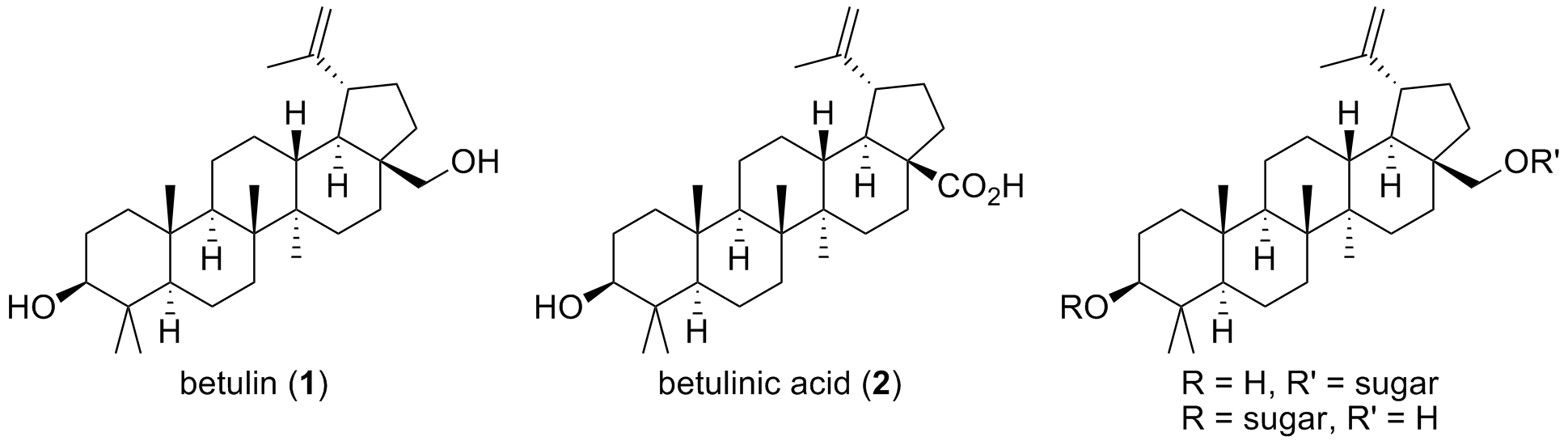 Betulin (1) and betulinic acid (2) are natural compounds with proven anticancer, anti-bacterial, antimalarial, antiviral and anti-inflammatory activities [1, 2]. Recent investigations have demonstrated that even a simple modification of the structure can significantly increase their biological activity. Lupane saponins (triterpenes bearing sugar moiety at C-3 or C-28 positions) are also considered as very promising cytotoxic derivatives [3].