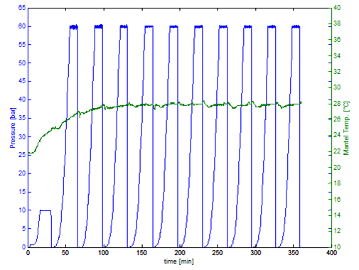 Fig.2. Course of process variables for cyclical recurrence of technological recipe realisation. The reactor has a unique design of a process chamber, which used in conjunction with a batch control system allows a highly efficient production of nanopowders to be obtained. The MSS2 reactor and its previous version MSS1 can be used for the scale-up production of nanomaterials characterised by a high commercial potential, and can be applied particularly in electronic, optoelectonic, pharmaceutical, chemical, cosmetic, ceramic and machine industries. The main areas of development of these devices, and simultaneously, cooperation with scientific partners and commercial companies include the following: improvements of reactors (new measurement systems, an intelligent reactor), design of new reactors (higher pressure, multi closed vessel), design of a technological line, mass production of new materials. |