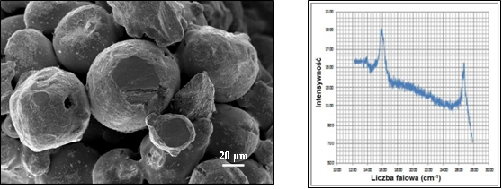 The Institute of Precision Mechanics developed CarboTermoFluid® technology for producing graphene on the grains of powder which is called Graphene 3DIMP. This technology can produce graphene on powders of metals and non-metals of different geometry and size of powder grains. Graphene formed on the copper powders can be used to manufacture: electrical contacts with high thermal and electrical conductivities, transmission cables, heat exchangers, radiators, bearings, lubricants, and pastes. Identification of the formed graphene 3DIMP was performed by using Raman spectroscopy and scanning electron microscopy (SEM). Image of Cu grain coated with graphene 3DIMP and Raman spectrum of graphene are shown in Fig. 1 and Fig. 2, respectively.