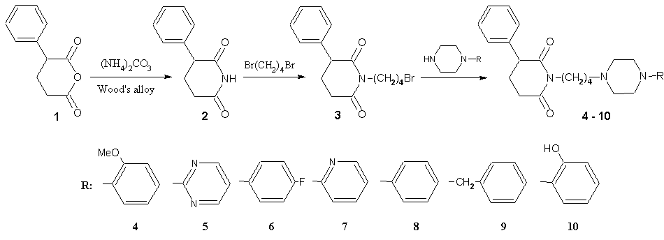 The class of arylpiperazines have been largely investigated as a group of compounds according to their ability to modify serotonergic neurotransmission via 5HT1A receptor interactions. Searching for new chemical substances expected to have an anxiety-relieving character, we have designed a new series of 4-[4-aryl/heteroarylpiperazin-1-ylbutyl) derivatives of 3-phenylpiperidine-2,6-dione 2, analoges of gepirone [1,2]. By alkylation of compound 2 with 1,4-dibromobutane, 4-(4-bromobutyl) substituted derivative 3 was obtained. Next the latter was condensed with appropriate amines to yield compounds 6-10. The structure of all derivatives of compound 2 have been established on the basis of elemental analysis and 1H NMR spectra. Compounds 4 and 6 were given to the Department of Crystalography, UMCS in Lublin, for X-ray single-crystal analysis, performed by prof. dr hab. A.E. Kozioł. Several compounds were given to the Department of Toxicology, The Medical University of Lublin, for pharmacological screenings, performed by prof. dr hab. E. Jagiełło-Wójtowicz.