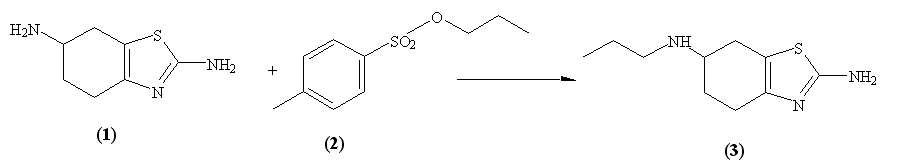 Pramipexole is a new generation dopamine receptor agonist, used as antiparkinson and antidepressant drug. It shows significant lower side effects compared to previous generation drugs (e.g. imipramine). Pramipexole, namely (S)-(-)-2-amino-6-propylamino-4,5,6,7-tetrahydrobenzotiazole (3) is obtained by direct alkylation of (S)-(-)-2,6-tiamino-4,5,6,7-tetrahydrobenzotiazole (1) with n-propyl tosylate (2) and isolated as monohydrate of dihydrochloride.