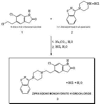Ziprasidone (5-(2-(4-(1,2-benzisothiazol-3-yl)piperazinyl)ethyl)-6-chloro-1,3-dihydro-2(1H)-indol-2-one hydrochloride monohydrate (3)) with the chemical formula C21H21ClN4OS* HCl*H2O) is a new antipsychotic with combined dopamine and serotonin receptor antagonist activity. Clinical trials suggest that the drug is an effective antipsychotic in schizophrenia and schizoaffective disorder with a beneficial effect on negative symptoms and symptoms of depression.