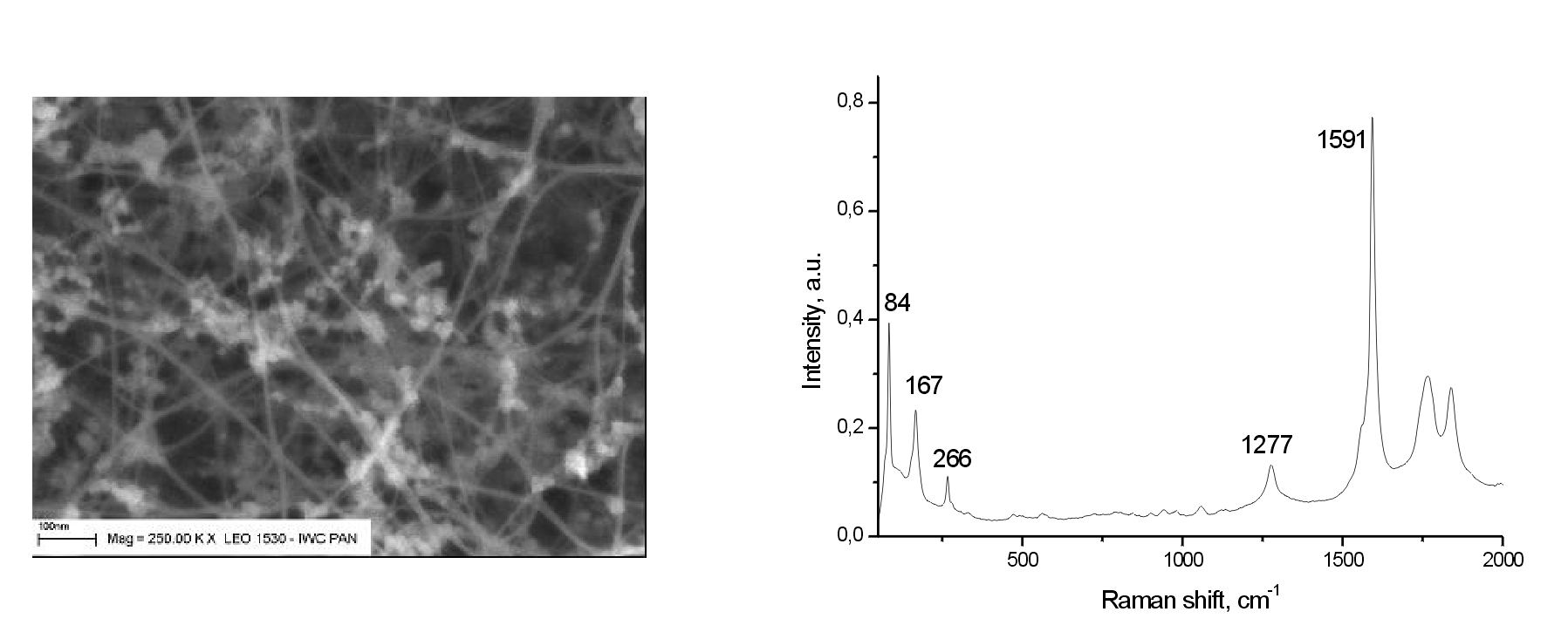 The carbon nanotubes (CNTs) can be classified as the 1-D crystals. The catalytic chemical vapor deposition (CCVD) and carbon arc plasma sublimation of graphite are at present the most explored ways of CNTs production on a large scale. Whether the products are single- or multi-walled carbon nanotubes (SWCNTs and MWCNTs, respectively) it depends on the selection of the catalyst and process conditions. In the case of the CCVD method the starting carbon bearing materials also play a crucial role for the final product. In fact, there is a large variety of liquids and gaseous hydrocarbons that can be used for efficient CNTs synthesis. The objective of this work was the synthesis of the SWCNTs from ferrocene aliphatic alcohol solutions by the CCVD method. The influence of alkyl chain length on the SWCNTs synthesis was investigated. The alcohols were injected to the reactor, a quartz tube placed in a furnace, in the liquid phase or as an aerosol. The carrier gas was Ar. The feeding rate, digitally controlled, was varied between 0.1 and 3 ml s-1. Also the temperature distribution along the furnace was the variable parameter. The morphology of the obtained products were investigated by scanning and transmission electron microscopy (SEM and TEM, respectively). The quality of the CNTs were also analyzed by using the Raman spectroscopy. An example of SEM image and Raman spectrum of SWCNT product obtained from pentanol are shown in figure below, left and right respectively.